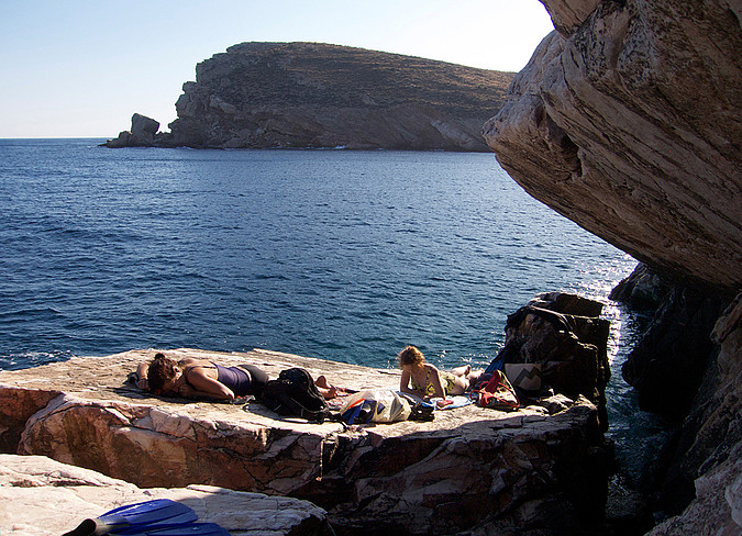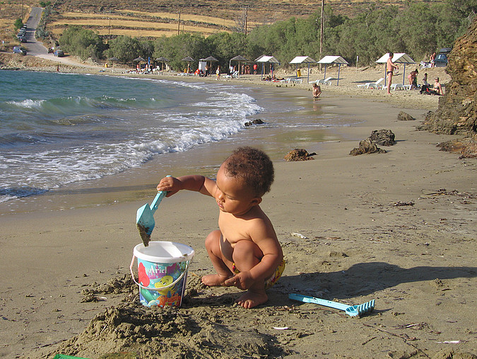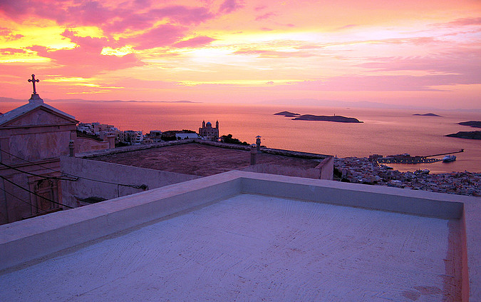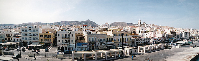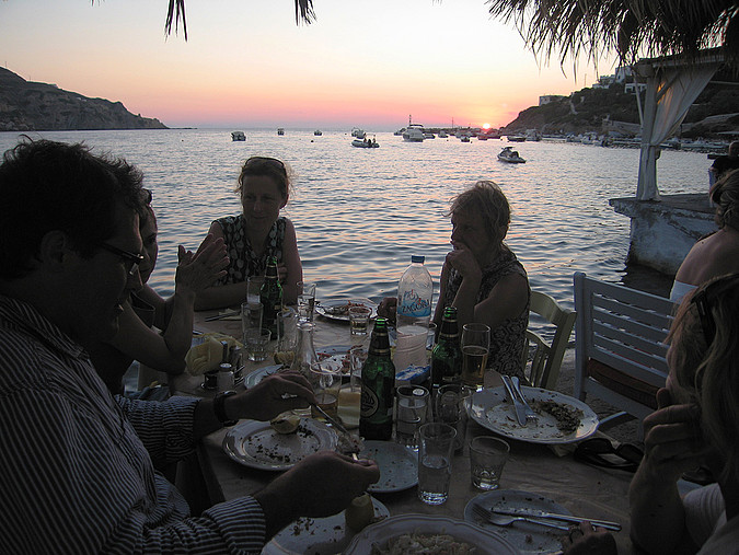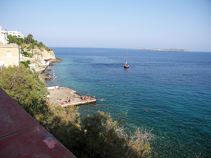 Strandtaverne in KiniJeden Morgen, und in der Sommersaison meist auch abends, verlässt ein Schiff den Hafen von Piräus in Richtung Syros und Kykladen. Und fast jeden Tag fliegt ein kleines Flugzeug vom Athener Flughafen Spata nach Syros. Das Schiff benötigt vier Stunden, das Flugzeug 25 Minuten. Sowohl vom Hafen in Ermoupoli (ca 6 €) wie vom Flughafen in Manna aus (ca 10 € inkl. Gepäck) ist es mit Sack und Pack unerlässlich, ein Taxi nach Ano Syros zu nehmen. Dem Fahrer gibt man als Destination «Ano Syros, Apàno Terma» (= obere Haltestelle) an. Das ist zuhinterst auf dem Hügelkamm, der zur Bischofskirche führt. Mit der Kirche vor Augen geht man etwa 7 Minuten, bis man am Bischofssitz vorbeikommt, steigt rund zwanzig Treppenstufen hinunter bis zur Kirche der «Allerheiligsten Jungfrau vom Berge Karmel» mit ihrer Marmorfassade. Hier kommt schon, zehn Meter geradeaus, das Haus Bourgos zum Vorschein. Wer sich verlaufen hat oder unsicher fühlt, fragt nach «Christoforos», und fast alle Leute am Weg wissen, wo dessen Haus steht ("Olo efthìa" heisst: alles geradeaus!). Sollte der Schlüssel nicht an der Tür des reservierten Apartments stecken, muss die Hausverwalterin angerufen werden. Deren Sprachkenntnisse beschränken sich auf wenige Worte Französisch. Ihre Dienste werden von uns pauschal abgegolten; sie ist jedoch einem kleinen Trinkgeld niemals abgeneigt, das man ihr geben oder im Zimmer lassen kann.