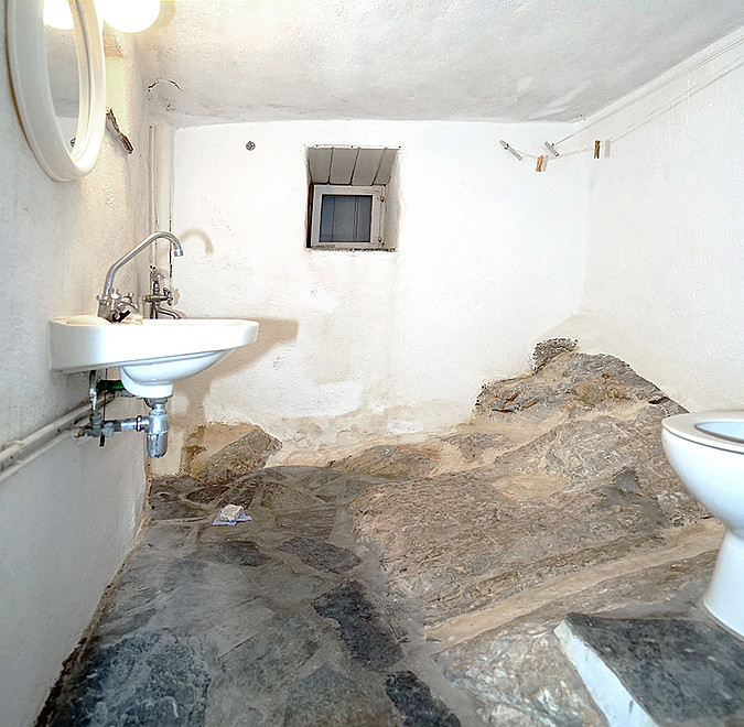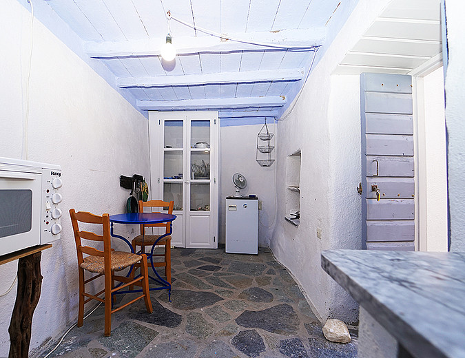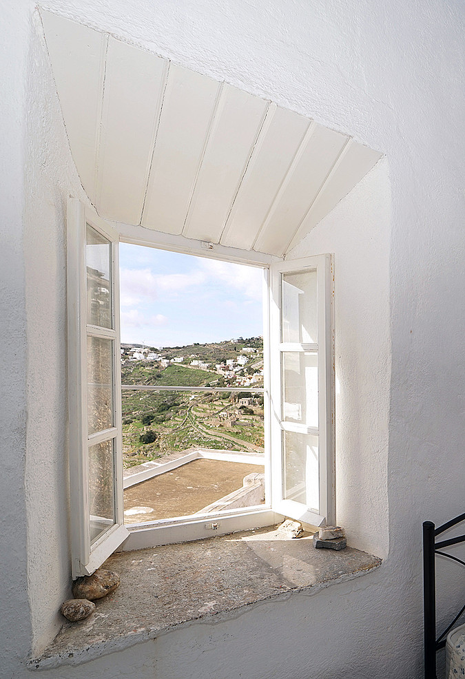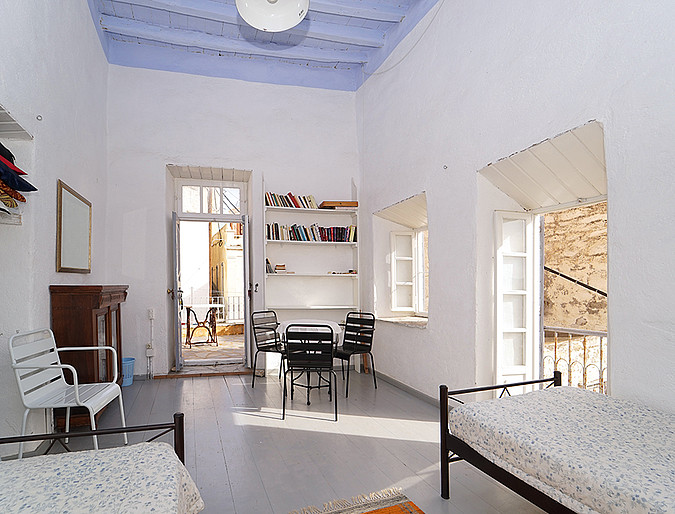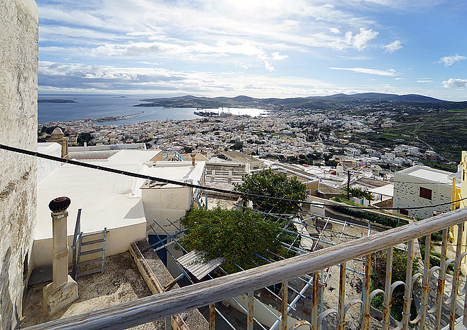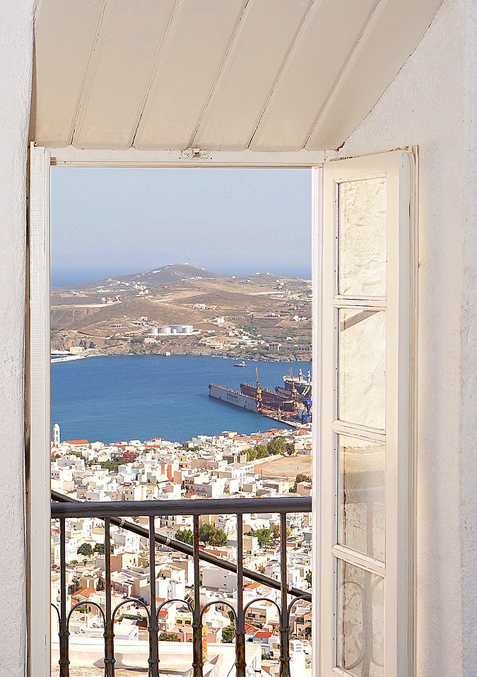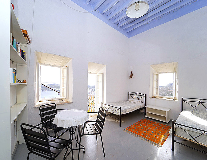 Apartment 1, Das FelsenbadGrosses Südzimmer (zwei Betten) im ersten Stock, angrenzend an die ostseitige Terrasse. Felsenbad und Küche sind über die Terrasse erreichbar. Weitreichende Sicht vom Balkon aus über den Hafen von Ermoupoli und übers Meer. In der Ferne die Inseln Naxos und Paros. Bei Bedarf wäre im Zimmer auch noch Platz für ein Kinderbett. Dank der Raumhöhe von über vier Metern ist es hier auch in der Sommerhitze noch zum Aushalten.