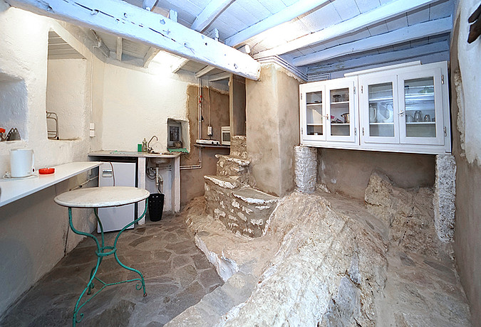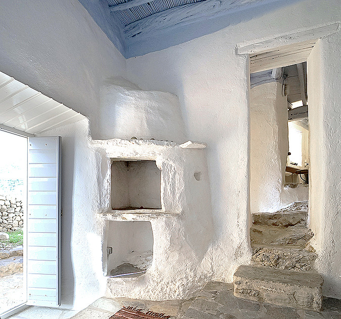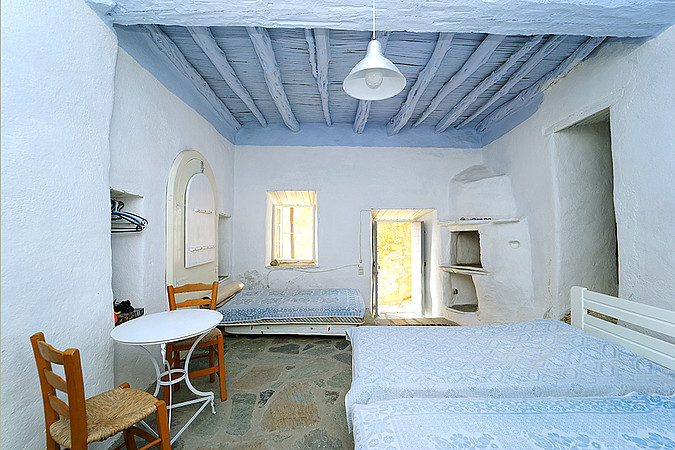 Apartment 3, Die KücheDreibettzimmer im Erdgeschoss. Kein Blick nach Süden, jedoch Anteil an der schmalen Veranda westseitig mit etwas Meersicht. Ein französisches und ein Einzelbett werden ergänzt durch ein untergeschobenes, 160 Zentimeter langes Kinderbett, so dass eine Familie mit bis zu zwei Kindern Platz findet. Im Sommer ist dies klimatisch der angenehmste Raum, weil ohne direkte Sonneneinstrahlung; er liegt unter der westseitigen Veranda des Obergeschosses und am alten Stadttor, unter dessen Bogen sich früher der Kühle wegen die strickenden Frauen trafen. In einer Ecke des Raumes steht noch ein Tzaki, eine Feuerstelle, die einst auch zum Kochen diente. Das Deckengebälk besteht aus knorrigen Arreftiés, einer Zypressenart, die auf der Insel seit Jahrhunderten ausgerottet ist. Die Decke ist mit einem kräftigen Schilfrohr ausgelegt und im typischen Lulaki (lila) gestrichen. Nur am späten Nachmittag scheint die Sonne bis zu ihrem Untergang durchs Fenster der Küche, in die man über einen neulich eröffneten Mauerdurchbruch gelangt; sie ist mit ihren belassenen Felsbuckeln und Steintreppchen kein alltäglicher Raum. Früher hausten hier Schafe und Ziegen.