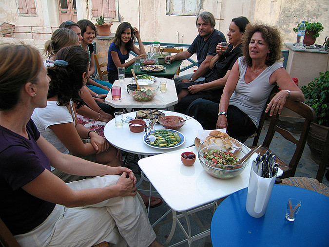Ab und zu Gäste auf der TerrasseDas Anwesen verfügt im Haupthaus nebst der Privatwohnung über drei sehr unterschiedliche Wohneinheiten, alle schmucklos und nur mit dem Unverzichtbaren ausgestattet, um die Wirkung der Räume und deren Materialität nicht zu stören. Nicht jedes Fenster ist dem Meer zugewandt. Schutz vor Feind und Wetter, nicht die schöne Aussicht, war damals Zweck des Bauens. Westseitig eine schmale Veranda und ostseitig eine breitere Terrasse laden zu Frühstück oder abendlichen Plauderstunden im Freien. Für bis zu acht Gäste stehen insgesamt sieben Betten in drei Zimmern zur Verfügung. Jede Wohneinheit verfügt nebst WC/Dusche über eine separate Küche mit Herd, Backofen und Kühlschrank.